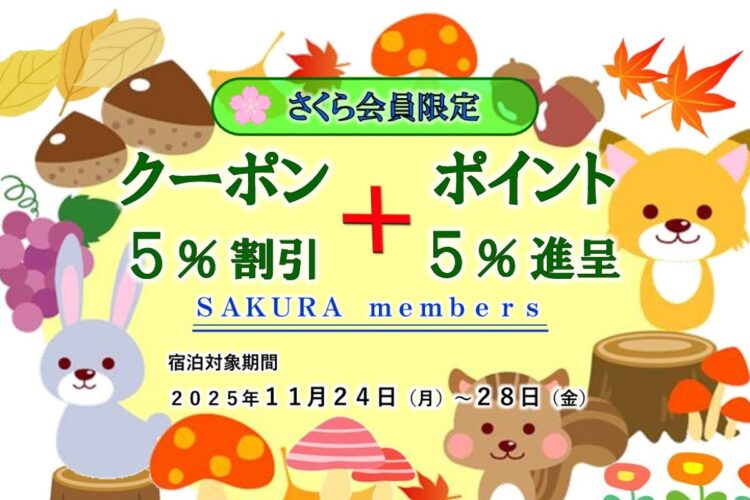 Topics Topics一覧 さくら会員限定5%OFFクーポン+ポイント5倍 2025.11.13 国営備北丘陵公園のイルミネーションが始まりました。 2025.11.9 さくら会員限定「月末クーポン」(10%割引)のご案内 2025.10.19 年末年始のご宿泊予約受付中です 2025.10.17 さくら会員限定5%OFFクーポン+ポイント5倍 2025.10.7 さくら会員限定「月末クーポン」(10%割引)のご案内 2025.9.23 さくら会員限定5%OFFクーポン×ポイント5倍 2025.9.8 秋の限定ランチメニュー 2025.9.3 休館日(9月8日~12日)のお知らせ 2025.8.30 さくら会員限定「月末クーポン」(10%割引)のご案内 2025.8.28 2週連続「さくら会員限定5%OFFクーポン×ポイント5倍」 2025.8.11 秋のご宿泊プラン 2025.8.8 1 / 1512345...10...»最後 »