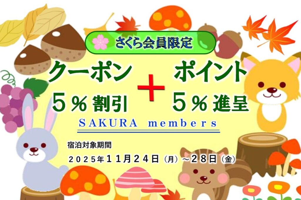 11月のさくら会員限定サービス「5%OFFクーポン+ポイント5倍」を、下記の期間にご利用いただけます。
